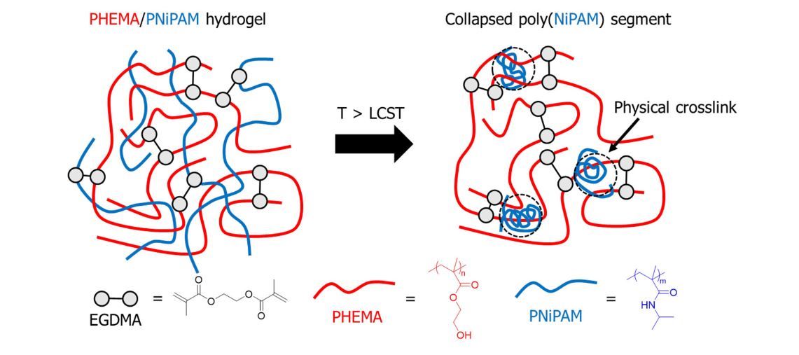 Schematic of Adhesive Material: When the temperature (T) is greater than the lower critical solution temperature (LCST), the polymer (PNiPAM) causes physical crosslinks in the hydrogel (PHEMA) to form, hardening the adhesive.
